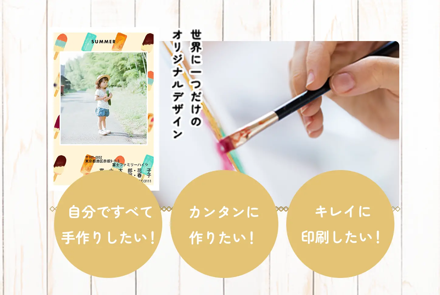 画像は写真印画紙にプリントして、はがきと貼り合わせて加工しているため、仕上げ時に4辺をカットいたします。 そのため通常のはがきサイズよりも一回り小さく仕上がりますので、必ず余白をとって作成して下さい。 文字を入れた画像の場合は、特に文字切れにご注意下さい。
